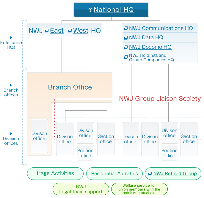 NWJ consists of 6 NTT group company-based Enterprise HQs and related organizations that had established for life support of union members.